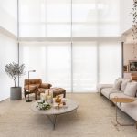 AKTA’s interior for this Vilnius home is built around material contrast and spatial clarity. The layout is open and uninterrupted, connecting the entrance, kitchen, dining, and living areas with minimal barriers. In the living room area, low-profile modular sofas face a textured wall of stone and ribbed panels. Natural stone is used throughout on walls, […]